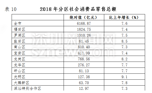 2018年,深圳全市社會(huì)消費(fèi)品零售總額6168.87億元,比上年增長(zhǎng)7.6%。按消費(fèi)類型分,商品零售額5424.38億元,增長(zhǎng)7.4%;餐飲收入額744.49億元,增長(zhǎng)8.4%。