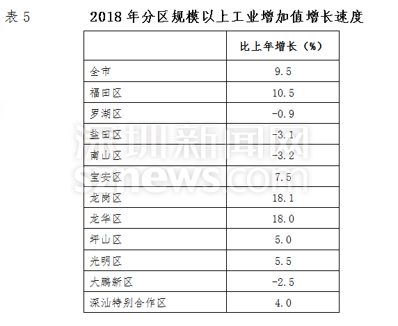 2018年,深圳全部工業(yè)增加值9254.00億元,比上年增長(zhǎng)9.0%。規(guī)模以上工業(yè)增加值增長(zhǎng)9.5%。在規(guī)模以上工業(yè)中,國(guó)有企業(yè)增加值下降21.4%;集體企業(yè)下降5.6%;股份制企業(yè)增長(zhǎng)12.8%;外商及港澳臺(tái)商投資企業(yè)增長(zhǎng)3.8%。分輕重工業(yè)看,輕工業(yè)增加值增長(zhǎng)6.2%;重工業(yè)增加值增長(zhǎng)10.2%。