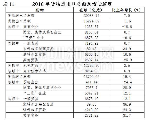 全年貨物進(jìn)出口總額29983.74億元,比上年增長(zhǎng)7.0%。其中出口總額16274.69億元,下降1.6%;進(jìn)口總額13709.05億元,增長(zhǎng)19.4%。出口總額連續(xù)二十六年居內(nèi)地大中城市首位。