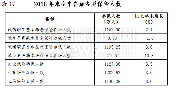 年末全市有1157.00萬(wàn)人參加了城鎮(zhèn)職工基本養(yǎng)老保險(xiǎn),1127.36萬(wàn)人參加了失業(yè)保險(xiǎn)。