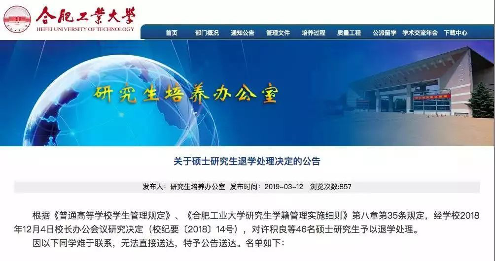 對46名碩士研究生予以退學(xué)處理,因其在學(xué)校規(guī)定的最長學(xué)習(xí)年限內(nèi)未完成學(xué)業(yè),或超過學(xué)校規(guī)定期限未注冊而又無正當(dāng)理由,且未經(jīng)請假離校連續(xù)兩周未參加學(xué)校的教學(xué)活動。