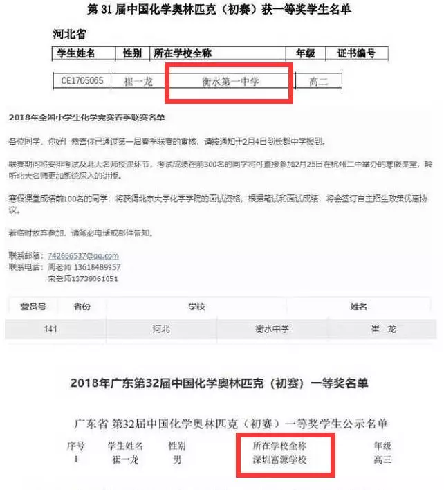 ↑ 家長(zhǎng)提供資料顯示,圖中這位叫崔一龍的學(xué)生,于2018年代表衡水一中參加31屆奧林匹克化學(xué)獎(jiǎng),而再其高三的時(shí)候又代表富源中學(xué)拿了一等獎(jiǎng)。
