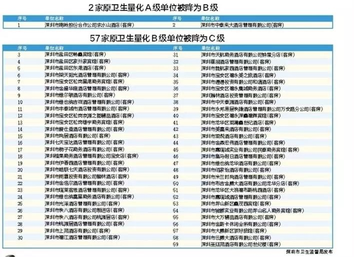 5、深圳市衛(wèi)生監(jiān)督部門自2018年12月開始集中開展專項整治行動。截至目前,行動中共檢查1660家酒店業(yè)單位,責令限期整改224家,立案95宗,共有59家單位在衛(wèi)生信譽等級評定復(fù)審工作中被予以“降級”,其中不乏部分知名連鎖酒店業(yè)單位。