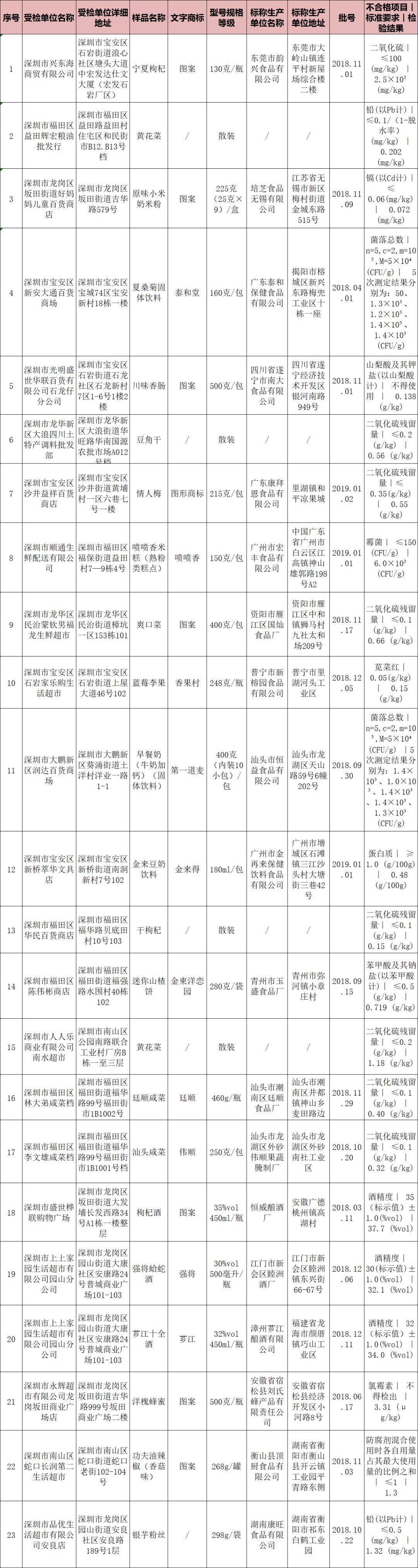 本次共抽檢流通環(huán)節(jié)食品2131批次,涉及流通環(huán)節(jié)經(jīng)營主體529家次,共檢測食品指標13373項次。其中檢出不合格樣品23批次,涉及不合格食品類別有茶葉及相關制品1批次,淀粉及淀粉制品1批次,蜂產(chǎn)品1批次,糕點1批次,酒類3批次,肉制品1批次,蔬菜制品6批次,水果制品4批次,特殊膳食食品1批次,調(diào)味品1批次,飲料3批次;涉及不合格項目類別為獸藥殘留、金屬等元素污染、微生物污染、食品添加劑、品質(zhì)指標。
