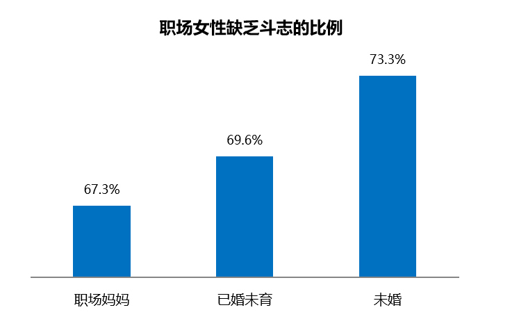 盡管來(lái)自生活和事業(yè)的雙重壓力較大,但是職場(chǎng)媽媽的職場(chǎng)斗志依然高昂。調(diào)查顯示,整體來(lái)看職場(chǎng)女性不加班的比例不足三成,職場(chǎng)媽媽群體的加班強(qiáng)度略僅低于其他女性職場(chǎng)人,有31.1%的職場(chǎng)媽媽不用加班。雖然職場(chǎng)的外部競(jìng)爭(zhēng)環(huán)境壓力大,但職場(chǎng)媽媽奮斗拼搏的精神氣很高。調(diào)研顯示,職場(chǎng)媽媽"經(jīng)?;蚺紶柍霈F(xiàn)缺乏工作斗志"的比例最低,為67.3%;已婚未育排在次位;未婚女性人群中缺少斗志的占比高達(dá)73.3%。