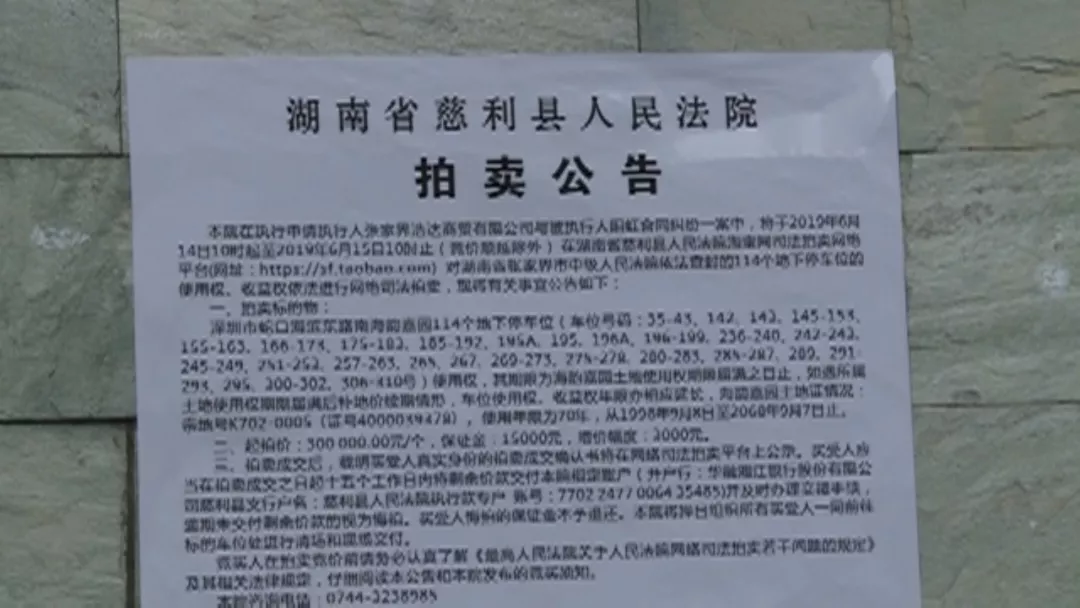 公告說,將強(qiáng)制拍賣114個(gè)停車位,網(wǎng)上拍賣時(shí)間是2019年6月14日至6月15日,落款是湖南省慈利縣人民法院。