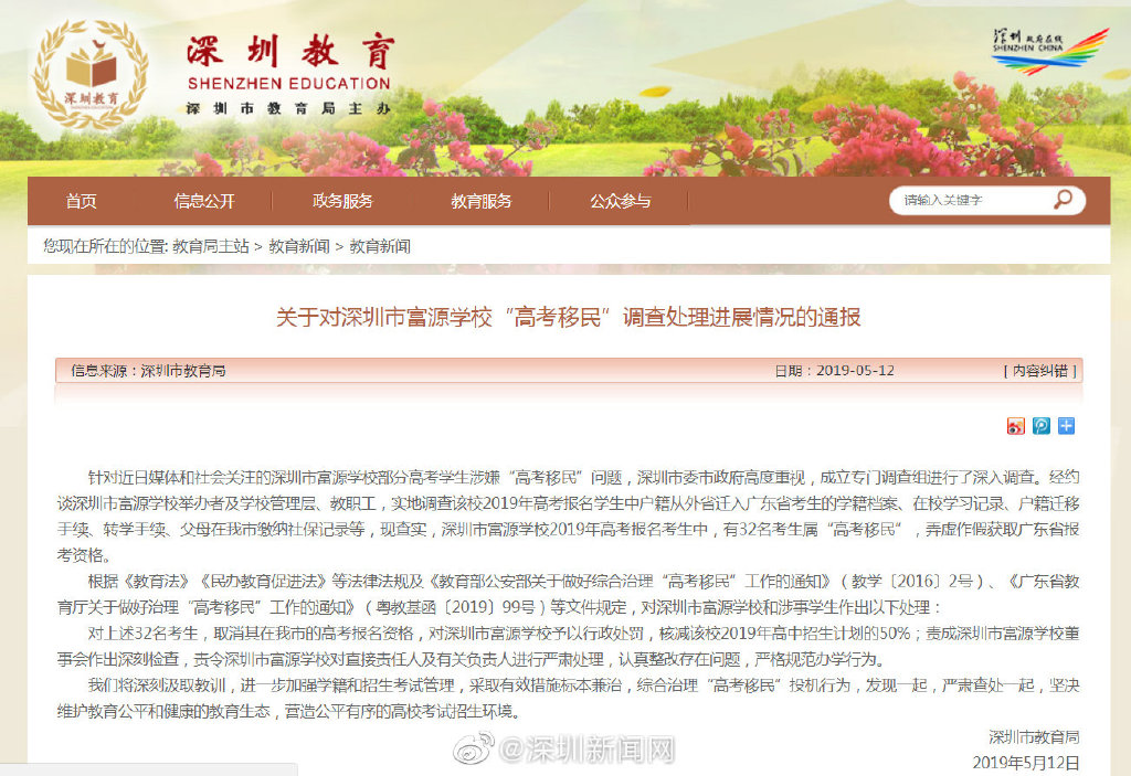 針對(duì)近日媒體和社會(huì)關(guān)注的深圳市富源學(xué)校部分高考學(xué)生涉嫌“高考移民”問題,深圳市委市政府高度重視,成立專門調(diào)查組進(jìn)行了深入調(diào)查。經(jīng)約談深圳市富源學(xué)校舉辦者及學(xué)校管理層、教職工,實(shí)地調(diào)查該校2019年高考報(bào)名學(xué)生中戶籍從外省遷入廣東省考生的學(xué)籍檔案、在校學(xué)習(xí)記錄、戶籍遷移手續(xù)、轉(zhuǎn)學(xué)手續(xù)、父母在我市繳納社保記錄等,現(xiàn)查實(shí),深圳市富源學(xué)校2019年高考報(bào)名考生中,有32名考生屬“高考移民”,弄虛作假獲取廣東省報(bào)考資格。