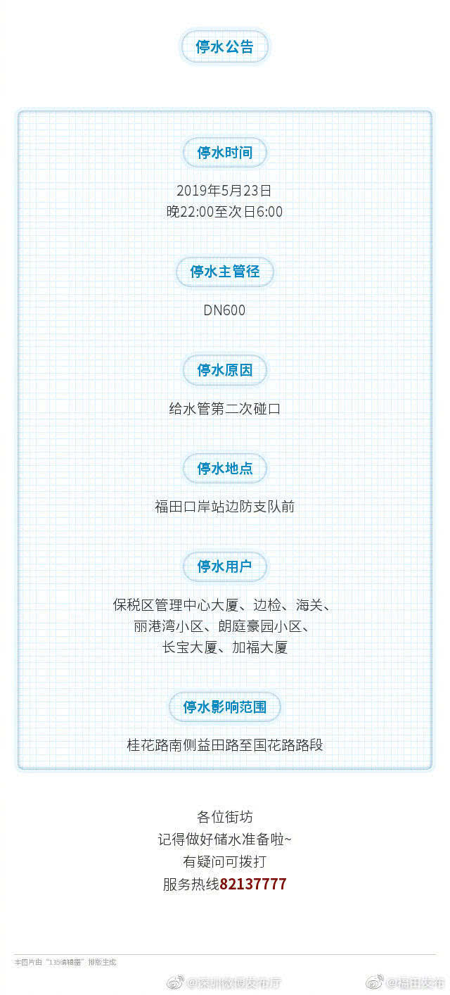 溫馨提醒!今天晚上22:00至明日6:00,福田區(qū)保稅區(qū)管理中心大廈、邊檢、海關(guān)、麗港灣小區(qū)、朗庭豪園小區(qū)、長寶大廈、加福大廈等區(qū)域?qū)⒂?jì)劃停水,各位街坊記得做好儲(chǔ)水準(zhǔn)備??!戳下圖了解更多停水停電資訊!
