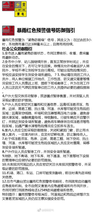 【上班天氣】暴雨:預(yù)計(jì)早晨6-9時(shí),全市陰天有暴雨,局部大暴雨伴有雷暴和6-7級(jí)短時(shí)大風(fēng),暴雨紅色分區(qū)預(yù)警信號(hào)生效中,請(qǐng)市民遠(yuǎn)離低洼易澇區(qū)、危房、邊坡、簡(jiǎn)易工棚、擋土墻、河道、水庫等可能發(fā)生危險(xiǎn)的區(qū)域,注意交通安全。