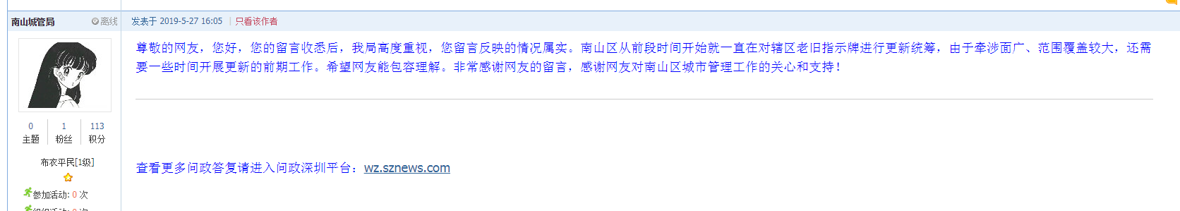 為及時(shí)解決網(wǎng)友疑問,5月27日下午,南山城管局在網(wǎng)友“syh19667288”發(fā)布的帖文下給予回復(fù)稱需要時(shí)間來開展更新工作。具體回復(fù)如下:
