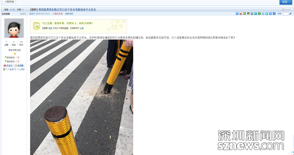 深圳新聞網(wǎng)2019年5月29日訊(記者 劉婷)“蓮花路景田東路交叉口這個安全島看起來不太安全?!苯?,網(wǎng)友“專打蒼蠅”在深圳論壇爆料稱,蓮花路景田東路交叉口安全島警示樁受損,存在安全隱患。5月29日,記者來到該路段實地勘察,發(fā)現(xiàn)安全島受損警示樁已全部整改。 (原帖文:蓮花路景田東路交叉口這個安全島看起來不太安全)