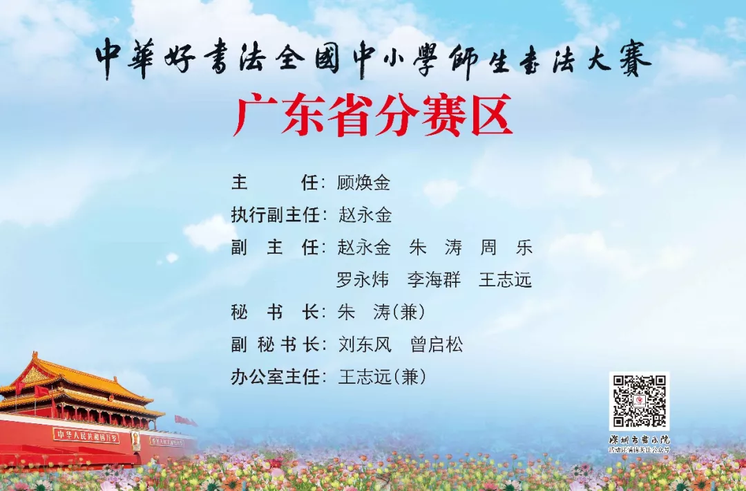 啟動儀式宣布成立“中華好書法”全國中小學(xué)師生書法大賽廣東省分賽區(qū)組委會、評委會和秘書處等工作機(jī)構(gòu)。顧煥金任廣東省分賽區(qū)組委會主任,趙永金任廣東省分賽區(qū)組委會執(zhí)行副主任,朱濤、羅永煒、周樂、李海群、王志遠(yuǎn)任廣東省分賽區(qū)組委會副主任,朱濤兼廣東省分賽區(qū)組委會秘書長,劉東風(fēng)、曾啟松任廣東省分賽區(qū)組委會副秘書長,王志遠(yuǎn)兼任廣東省分賽區(qū)組委會辦公室主任。