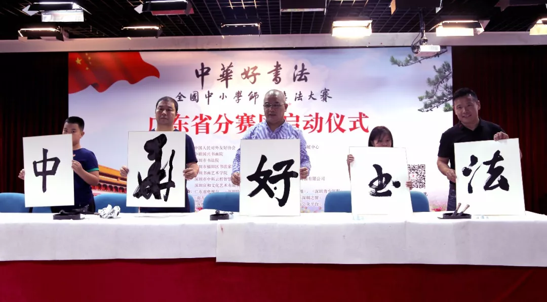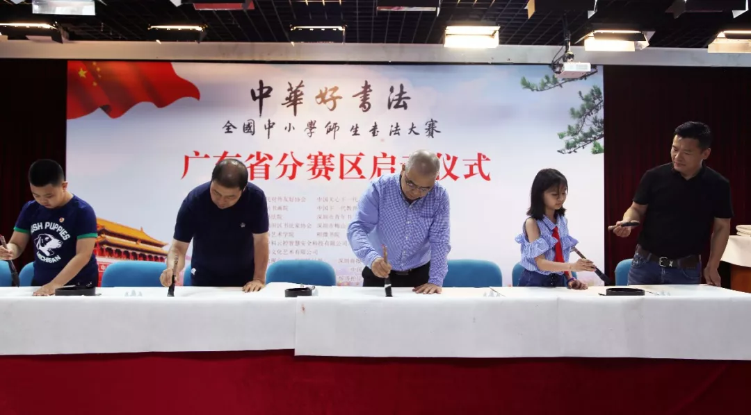 “中華好書法”全國中小學(xué)師生書法大賽廣東賽區(qū)組委會執(zhí)行副主任趙永金和教師代表趙軍、崔占海,學(xué)生代表劉子文、李唐心上臺開筆