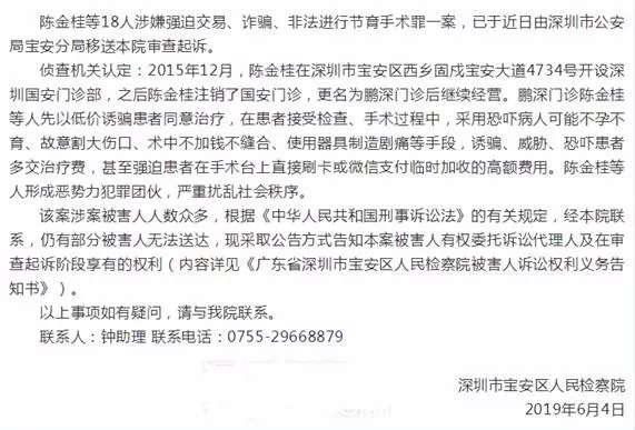 最近,寶安區(qū)人民檢察院就發(fā)布了一起案件公告,當(dāng)中顯示寶安區(qū)西鄉(xiāng)鵬深門診在病患接受檢查、手術(shù)治療過程中,為獲取不法利益,采用“惡意夸大病情、故意割大傷口及使用器具制造疼痛”等手段,誘騙、威脅、恐嚇患者多交治療費(fèi),近日鵬深門診18人被起訴。