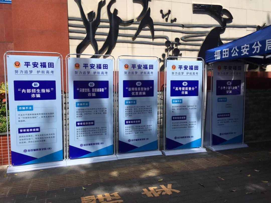 高考結束后,與高考相關的一些詐騙也進入了活躍高峰期。福田分局制作了高考反詐騙相關展板,在全區(qū)范圍內的6個考點出入口顯眼處擺放,提醒告誡考生及家長注意高考相關詐騙手法。