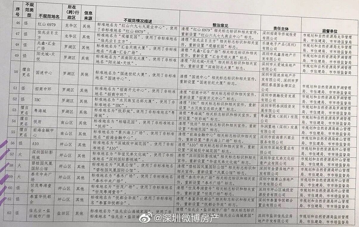 6月22日,深圳出爐了首批需清理整治的名單,涉及62個(gè)樓盤。記者從市規(guī)劃和自然資源局獲悉,深圳本次整治的重點(diǎn)為預(yù)售樓盤不規(guī)范地名使用和道路名稱不規(guī)范等問題,使用時(shí)間較長、社會(huì)和群眾認(rèn)可度較高的地名原則上不納入整治范圍。此外,整治原則上不涉及不動(dòng)產(chǎn)權(quán)證、戶口本、身份證等相關(guān)證照的變更。