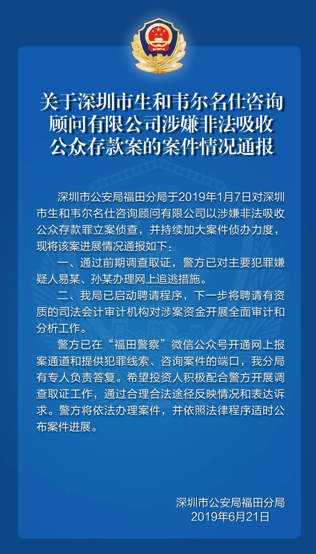 關(guān)于深圳市生和韋爾名仕咨詢顧問有限公司涉嫌非法吸收公眾存款案的案件情況通報(bào)