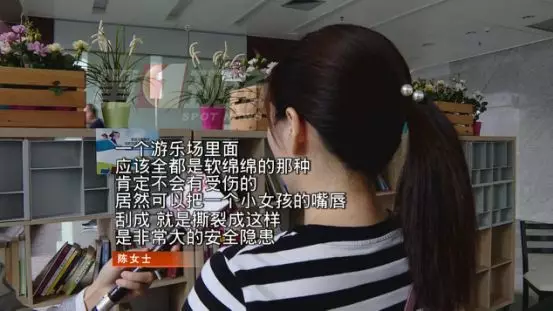 陳女士說,這個臺階原本是用一層軟軟的泡沫包裹,并用鎖扣固定的。這個鎖扣原本也應該要包裹起來,但不知為何卻裸露在外。陳女士的女兒這么一摔,正好磕在硬硬的鎖扣上,嘴巴被劃了一個口子。