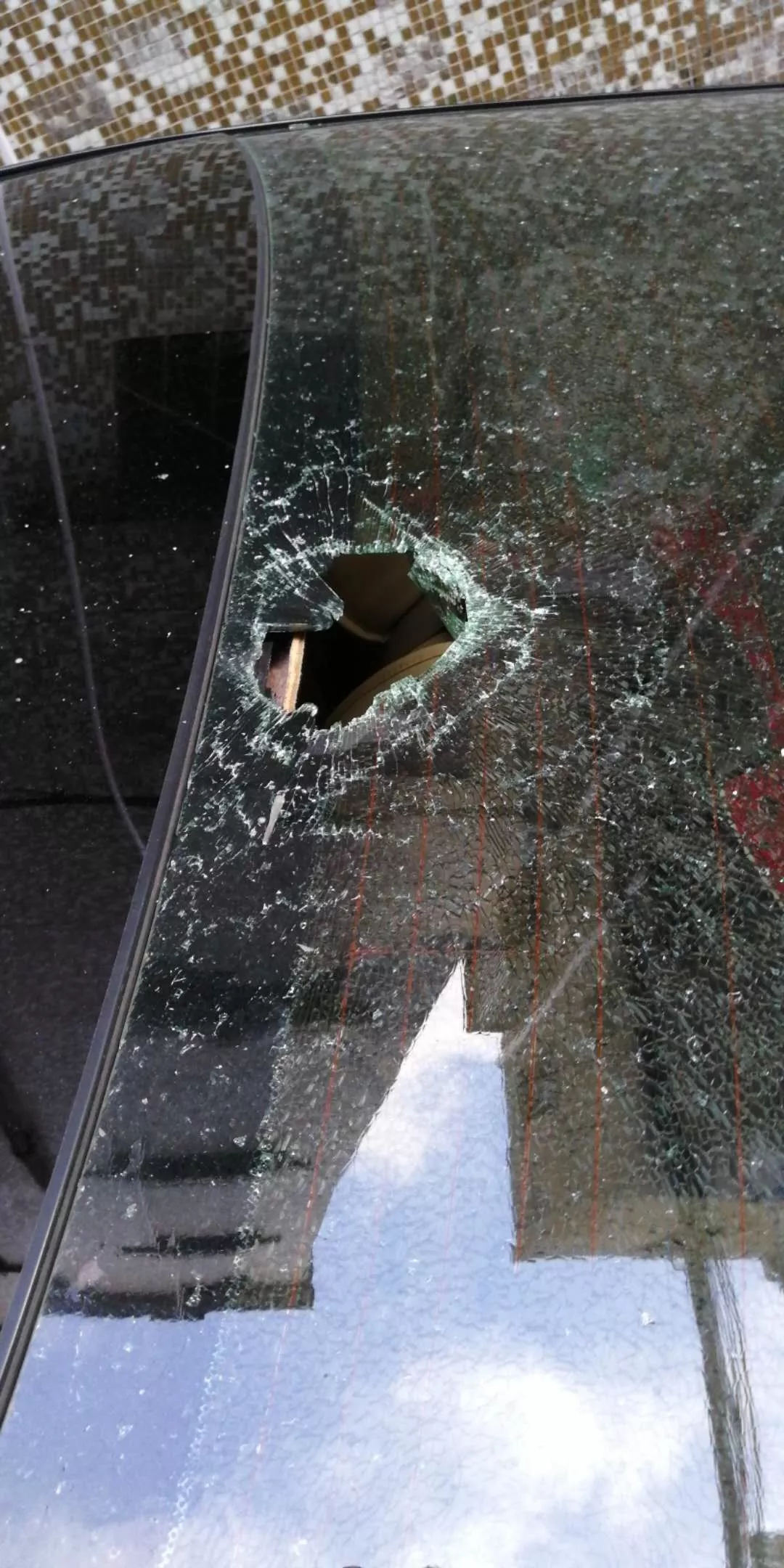 ▲車玻璃被砸了一個大洞