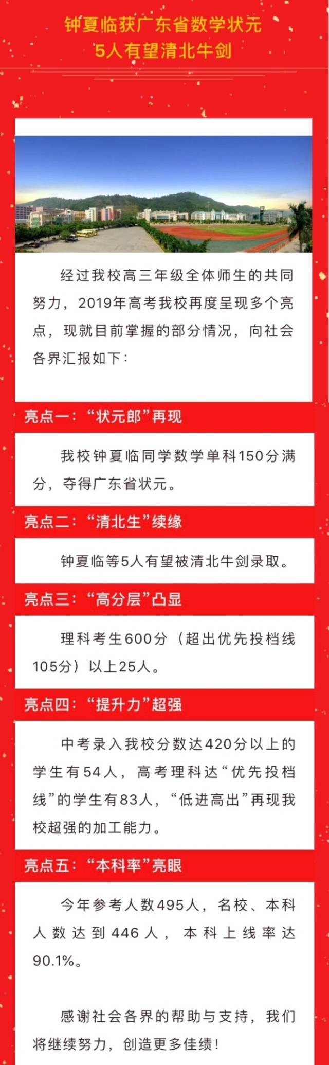 學(xué)校稱其2019年高?!案叻謱印蓖癸@,理科考生600分(超出優(yōu)先投檔線105分)以上25人;“本科率”亮眼,今年參考人數(shù)495人,名校、本科人數(shù)達(dá)到446人,本科上線率達(dá)90.1%;此外,還提到“提升力”,稱中考錄入該校分?jǐn)?shù)達(dá)420分以上的學(xué)生有54人,高考理科達(dá)“優(yōu)先投檔線”的學(xué)生有83人,實(shí)現(xiàn)“低進(jìn)高出”。