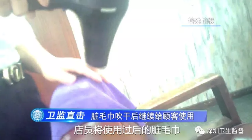 更讓人無法接受的是,當干凈毛巾不夠用的時候,店員將使用過后的臟毛巾,未經(jīng)過清洗消毒,就用吹風機吹干后,重新放回干凈毛巾取用架內(nèi),繼續(xù)直接給顧客洗頭、擦臉用。