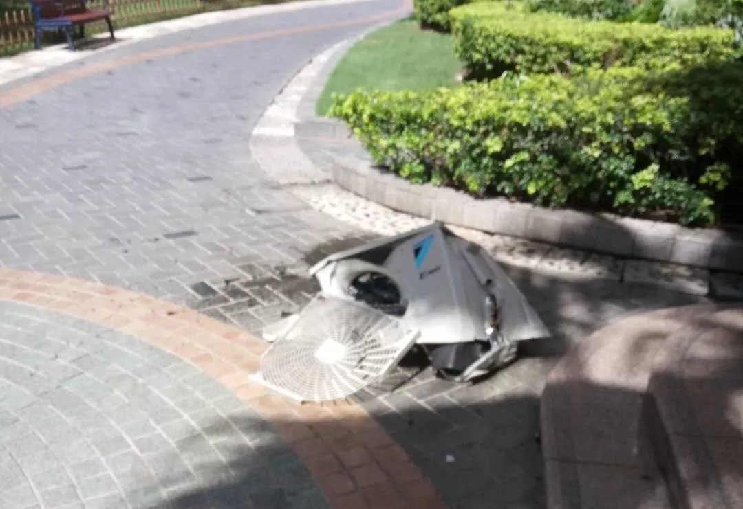 深廣電第一現場2019年7月1日訊 今天下午,福田區(qū)萬科金色家園小區(qū)一臺空調主機從11樓墜下!巨大的聲音把業(yè)主嚇得不輕?。?!空調外機應該是固定好的怎么就會掉下來了?