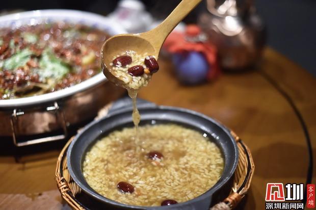 紅糖陰米粥作為主食,溫潤(rùn)甘甜,口感濃稠,小米粥里熬煮了紅棗枸杞,補(bǔ)血補(bǔ)氣,在一眾重油的江湖菜中可以解辣解膩,還能感受酒糟帶來(lái)的養(yǎng)生驚喜。