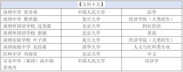 8名文科高分生報考院校集中在4所大學,分別為北京大學(3人)、清華大學(1人)、中國人民大學(2個)、復(fù)旦大學(2個),而報考北京大學的3人中,深圳外國語學校的邊美霖、惠婧已經(jīng)通過外語類保送考試,在高考之前已成功被北大錄取。在文科類學霸所選專業(yè)方面,經(jīng)濟學較為熱門,有3名學生選擇,占比近4成。