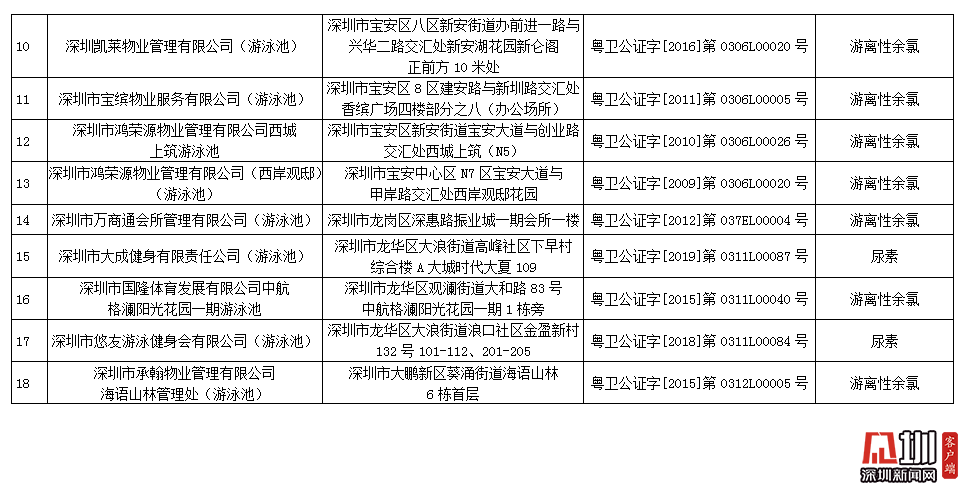 記者獲悉,深圳市夢六健身有限公司(游泳池)pH值和游離性余氯指標不合格,深圳市百利行物業(yè)發(fā)展有限公司中信紅樹灣花城物業(yè)管理處(游泳池)、深圳市大成健身有限責(zé)任公司(游泳池)、深圳市悠友游泳健身會有限公司(游泳池)尿素指標不合格,加福投資(深圳)有限公司福朋喜來登酒店(游泳池)、深圳市蓮花物業(yè)管理有限公司彩田村游泳場、深圳大中華國際酒店管理有限公司大中華希爾頓酒店(游泳池)、深圳市京基物業(yè)管理有限公司濱河時代物業(yè)服務(wù)中心(游泳池)、深圳新都酒店股份有限公司新都酒店(游泳池)、深圳陽光酒店(游泳池)、深圳市金地物業(yè)管理有限公司翠盈嘉園管理處(游泳池)、深圳凱萊物業(yè)管理有限公司(游泳池)、深圳市寶繽物業(yè)服務(wù)有限公司(游泳池)、深圳市鴻榮源物業(yè)管理有限公司西城上筑游泳池、深圳市鴻榮源物業(yè)管理有限公司(西岸觀?。ㄓ斡境兀?、深圳市萬商通會所管理有限公司(游泳池)、深圳市國隆體育發(fā)展有限公司中航格瀾陽光花園一期游泳池、深圳市承翰物業(yè)管理有限公司海語山林管理處(游泳池)游離性余氯指標不合格。衛(wèi)生監(jiān)督部門已責(zé)令抽檢結(jié)果不合格單位立即整改,并跟蹤整改情況。