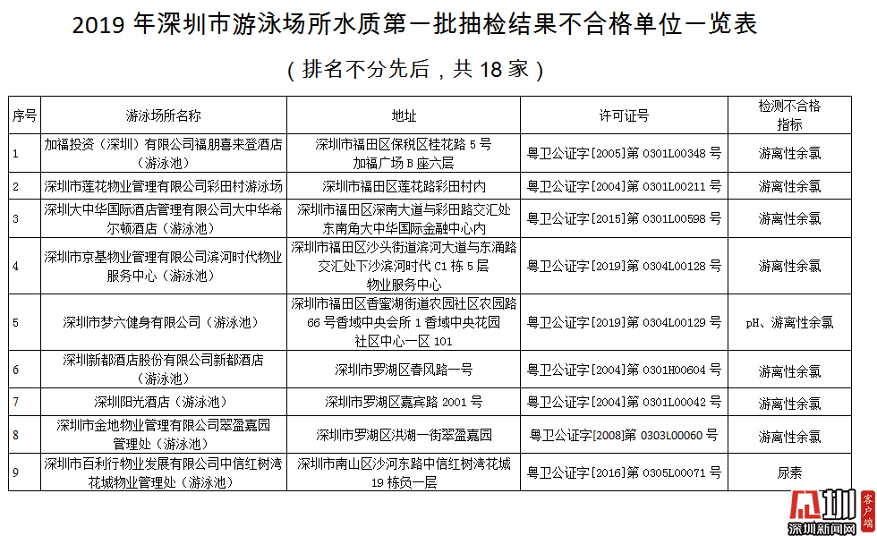 深圳新聞網(wǎng)2019年7月10日訊(記者 劉夢婷 通訊員 深衛(wèi)監(jiān))你常光顧的游泳池水質(zhì)如何?日前,深圳市衛(wèi)生監(jiān)督局公布了2019年第一批游泳場所水質(zhì)抽檢結(jié)果。在抽檢的435家游泳場所中,合格的有417家,合格率為95.86%,不合格18家,不合格率為4.14%,其中不乏知名五星級酒店。