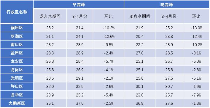 龍舟水期間(5月21日-6月20日),工作日早、晚高峰時段全市交通運(yùn)行較3-4月份(正常天氣情況)均呈現(xiàn)不同程度惡化,其中中心城區(qū)(福田區(qū)、羅湖區(qū))擁堵惡化明顯。