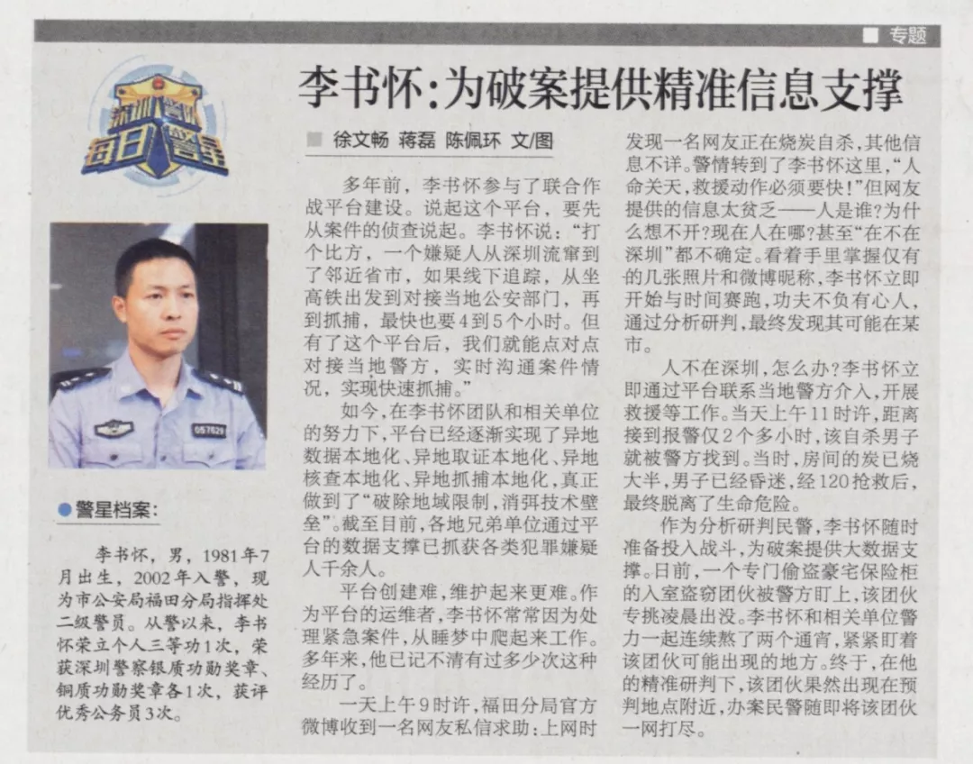 一天上午9時許,福田分局官方微博收到一名網(wǎng)友私信求助:上網(wǎng)時發(fā)現(xiàn)一名網(wǎng)友正在燒炭自殺,其他信息不詳。警情轉到了李書懷這里,“人命關天,救援動作必須要快!”但網(wǎng)友提供的信息太貧乏——人是誰?為什么想不開?現(xiàn)在人在哪?甚至“在不在深圳”都不確定。看著手里掌握僅有的幾張照片和微博昵稱,李書懷立即開始與時間賽跑,功夫不負有心人,通過分析研判,最終發(fā)現(xiàn)其可能在某市。