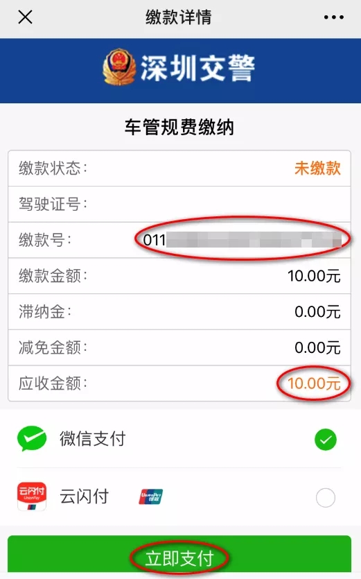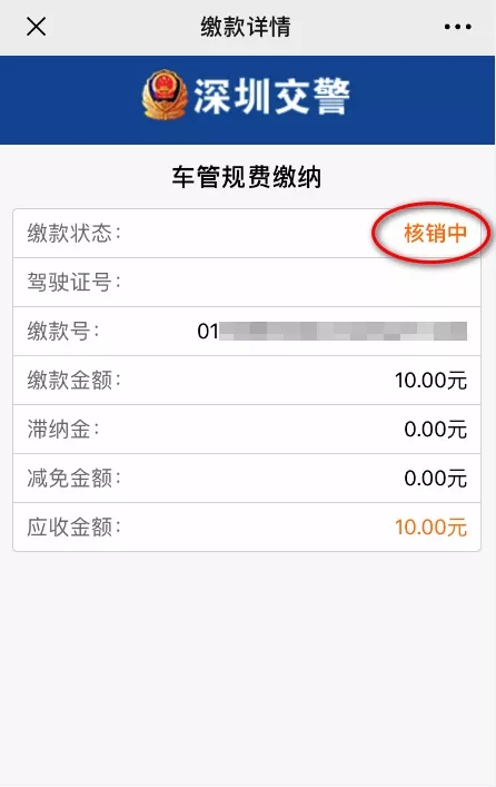 03 提交繳費(fèi)后,核對(duì)繳款號(hào)(前面會(huì)多01),應(yīng)收金額為10元。繳費(fèi)后再次查詢?cè)摿魉瑺顟B(tài)為“核銷中”(即繳費(fèi)成功)。