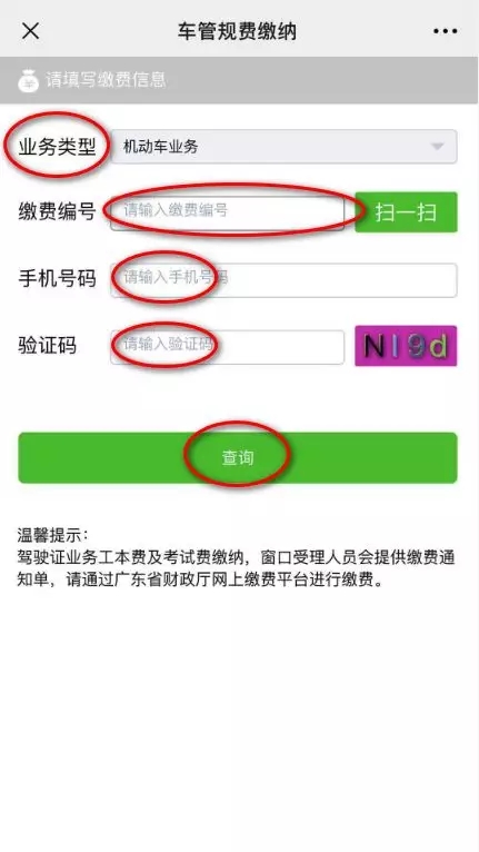 02 業(yè)務(wù)類型選擇【機(jī)動(dòng)車業(yè)務(wù)】,輸入繳費(fèi)編號(hào)(繳費(fèi)流水號(hào)),填寫本人/代理人手機(jī)號(hào)碼、驗(yàn)證碼后,點(diǎn)擊“查詢”。