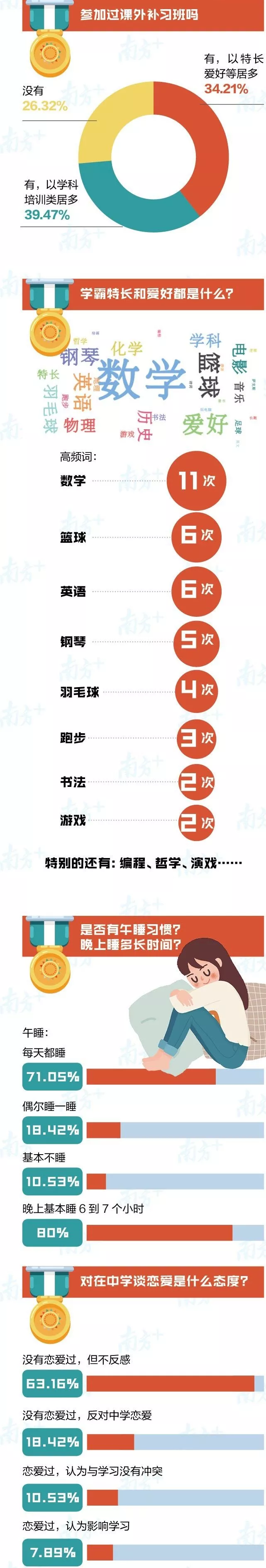 不論學(xué)習(xí)再緊張,80%的“牛娃”還是基本保證了6-7小時(shí)的晚間睡眠,還有超過(guò)70%的“牛娃”堅(jiān)持午睡,為下午的學(xué)習(xí)充充電。