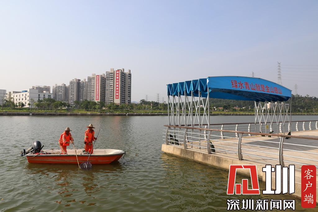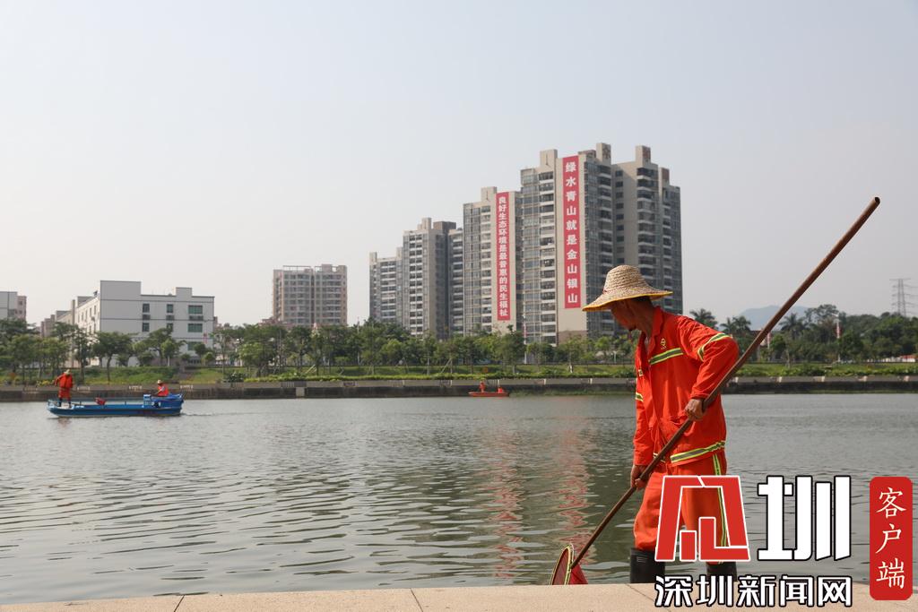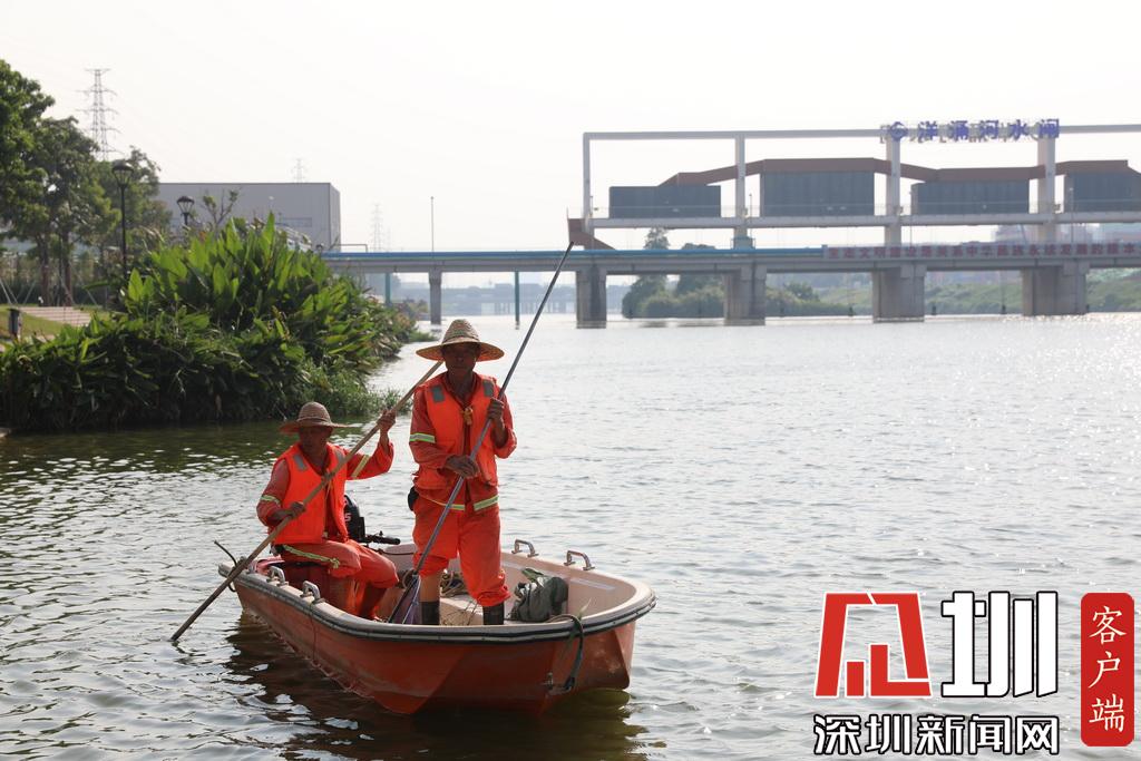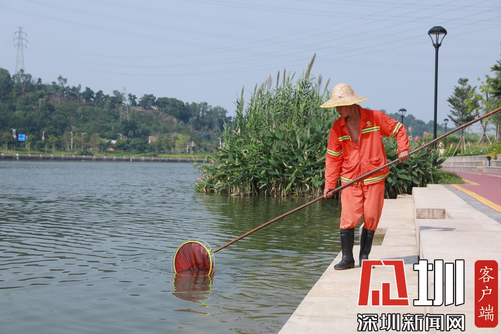 河道巡查人員在撈取河流中的漂浮物
