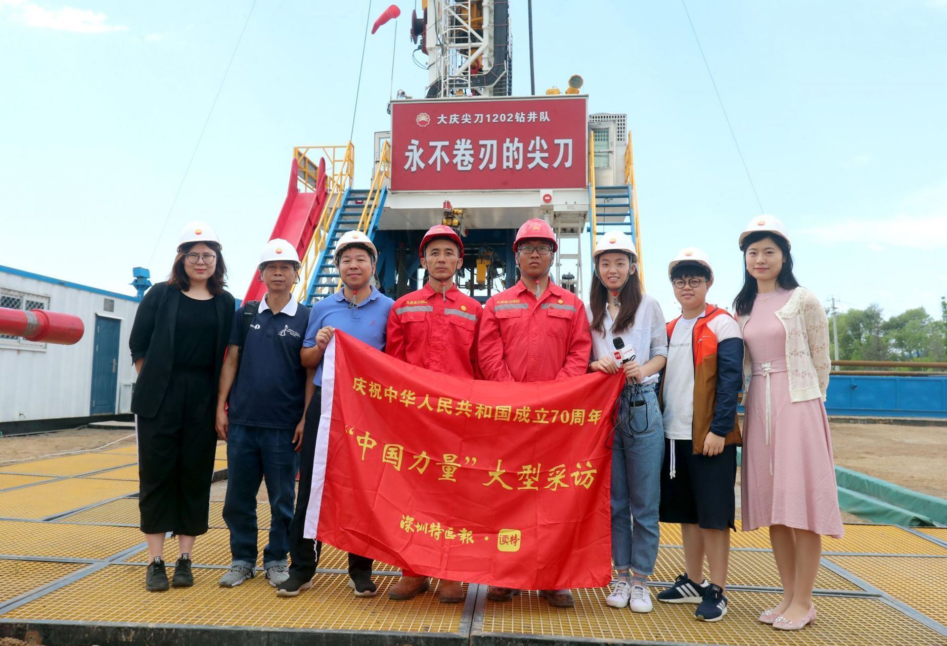 采訪組一行在1202尖刀隊鉆井臺現(xiàn)場采訪。