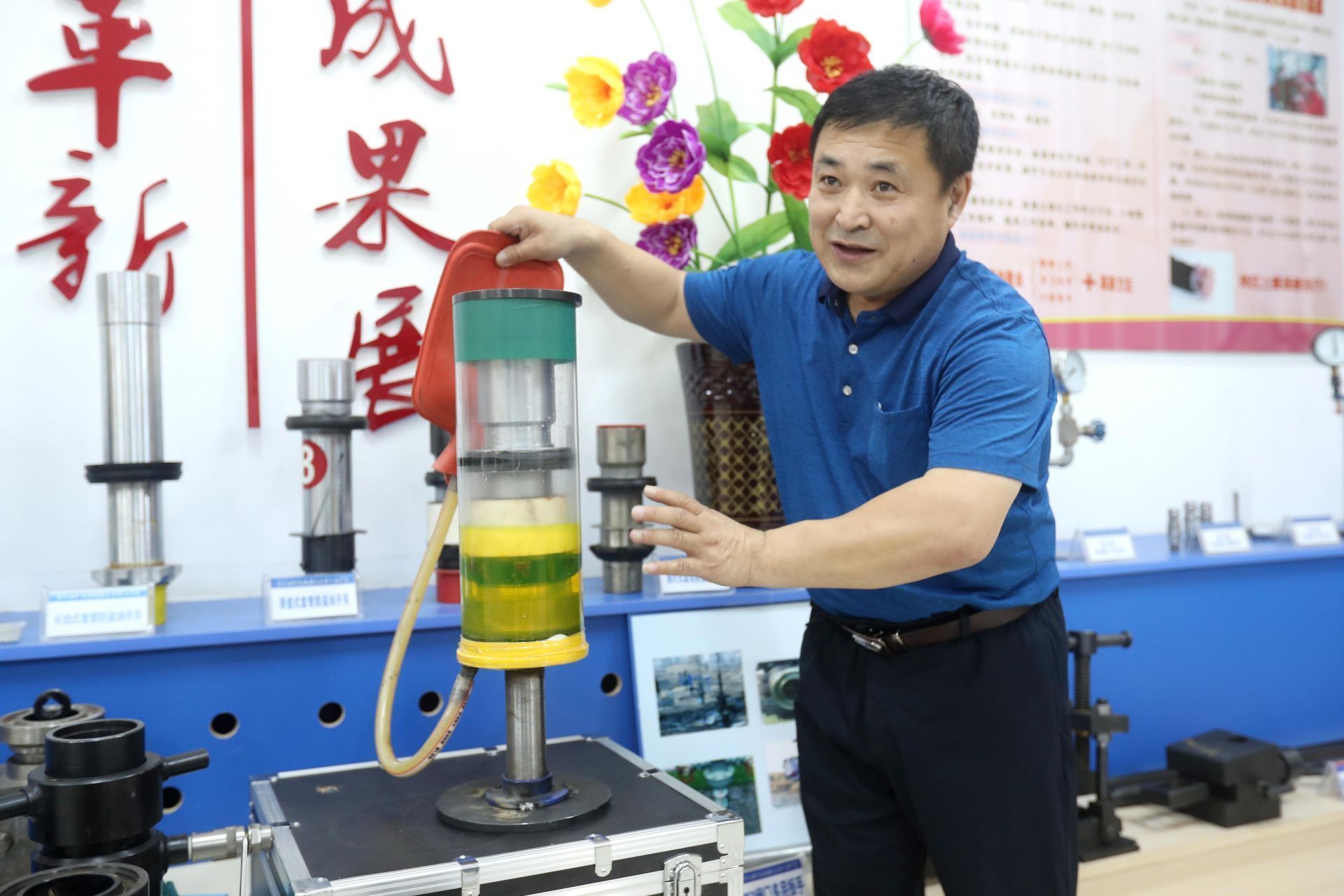 在大慶油田勘探開發(fā)研究院的陳列室里,一排排試管里裝滿了水和油,不同程度的水油對比值一目了然。在試管上方,是對應(yīng)的開采巖石,油提取的越多,石頭的顏色越淺?!耙淮尾捎褪强康貙幼陨韷毫Π延汀敗鰜?,二次采油是向地下注水把油‘擠’出來,現(xiàn)在大慶油田采用的三次采油技術(shù),靠化學劑把油‘洗’出來?!笨碧介_發(fā)研究院采收率研究一室主任工程師曹瑞波說。