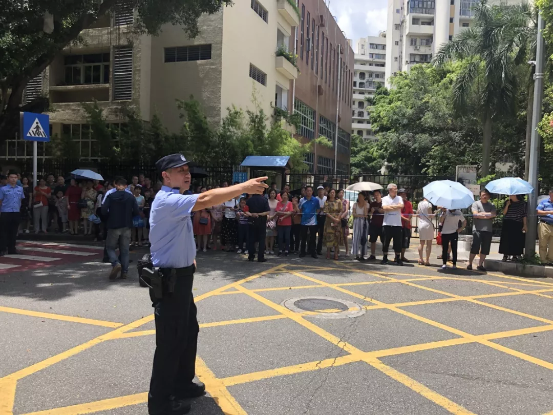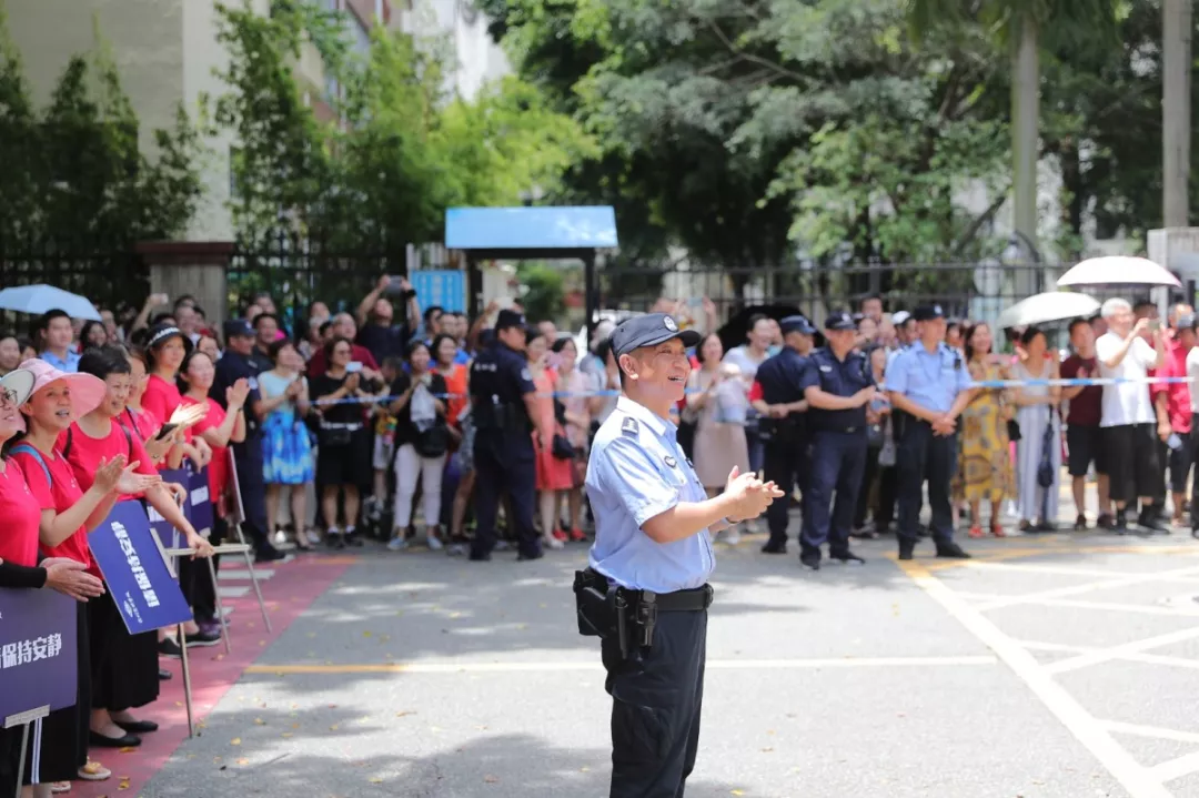 在深圳實驗中學(xué)的校門外,正在執(zhí)勤護考的通心嶺派出所所長林志強正跟送考的家長們“嘮嗑”?!按蠹叶颊具@么久了,辛苦了!一會考試結(jié)束后,咱們來猜一猜第一個走出來的是男生還是女生?!薄拔也率悄猩!薄拔也率桥?。”家長們一掃臉上焦急的表情,開始笑著討論起來。