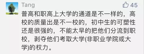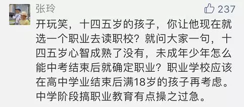 有網(wǎng)友表示:十四五歲的孩子行知尚未成熟,未成年少年無法在中考結(jié)束后就確定職業(yè),職業(yè)學校應該在高中學業(yè)結(jié)束后滿18歲的孩子再考慮。中學階段搞職業(yè)教育有點操之過急。