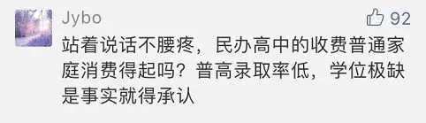 45.38%的公辦普高錄取率意味著有一半以上的學生上不了公辦普高,只能求其次,選擇職業(yè)學校和民辦高中。雖然說教育沒有高低之分,但是絕大多數(shù)家長都希望自己的孩子能夠上公辦普高,這也是競爭激烈的原因之一。為什么接受不了民辦高中?除了擔心辦學質(zhì)量問題,網(wǎng)友主要覺得民辦學費貴。