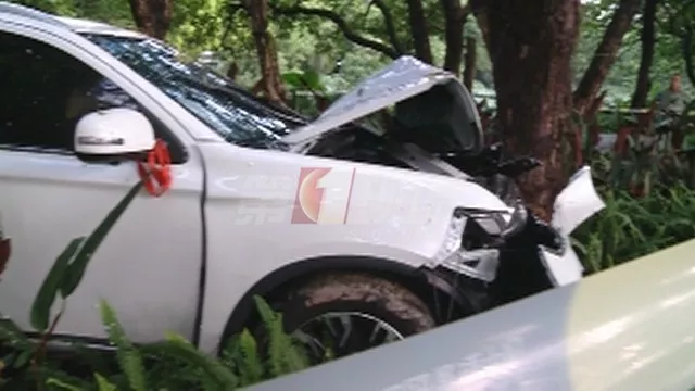 事情發(fā)生在7月21日下午3點(diǎn)50分,在事發(fā)現(xiàn)場(chǎng)可以看到一輛白色三菱汽車撞到了一棵樹(shù),車頭被撞得完全凹陷,支離破碎。