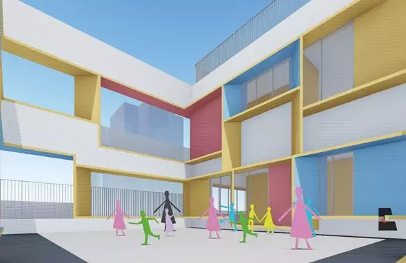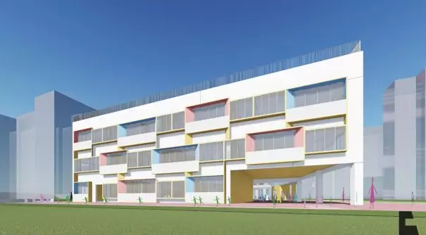 退距和滿(mǎn)足日照是首要解決的兩大問(wèn)題。項(xiàng)目與周邊多層住宅距離較近,在被3小時(shí)日照線(xiàn)及周邊建筑最近點(diǎn)的18米范圍線(xiàn)切割的用地上布置幼兒生活用房,同時(shí)保證主要的幼兒生活用房(即班級(jí)活動(dòng)單元)滿(mǎn)足日照情況下,自然形成了扭動(dòng)的班級(jí)活動(dòng)單元,借這個(gè)扭動(dòng)形成了本案的設(shè)計(jì)理念:(糖果盒子、愛(ài)與信念)。建筑造型反映新、奇、趣、美的建筑個(gè)性風(fēng)格。