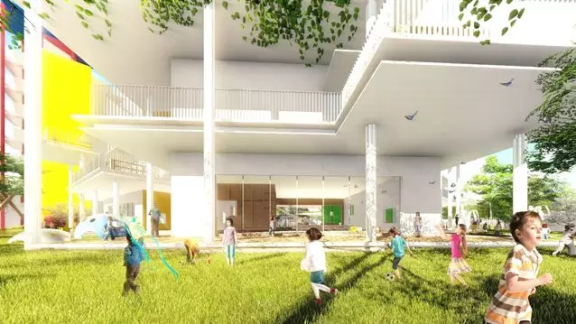 深圳市蓮花二村幼兒園重建校舍在緊張的用地中,首先退讓出一個(gè)完整的室外活動(dòng)場(chǎng)地。通過(guò)立體剪裁出層層退臺(tái)的多元化的活動(dòng)空間。南側(cè)向陽(yáng),北側(cè)遮雨,陰晴雨雪皆有孩子們的游樂(lè)天地。