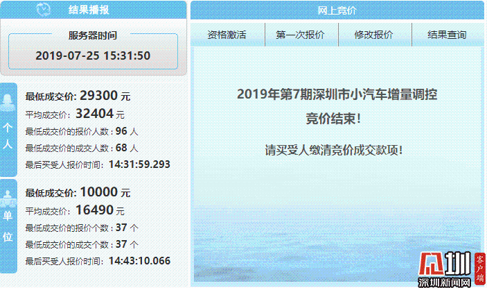 2019年第7期深圳小汽車車牌競(jìng)價(jià)結(jié)果截圖