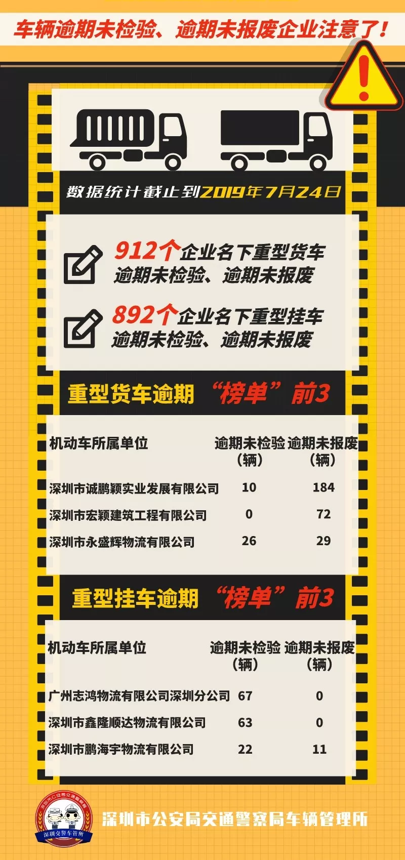 見圳客戶端·深圳新聞網(wǎng)2019年7月26日訊(見圳客戶端 深圳新聞網(wǎng)記者 何暢)車輛逾期未檢驗、逾期未報廢,存在著重大交通安全隱患,深圳部分企業(yè)不重視安全管理、名下有大量“問題車輛”未處理。7月26日“深圳交警權(quán)威發(fā)布”微信公眾號就對相關企業(yè)進行了點名曝光。