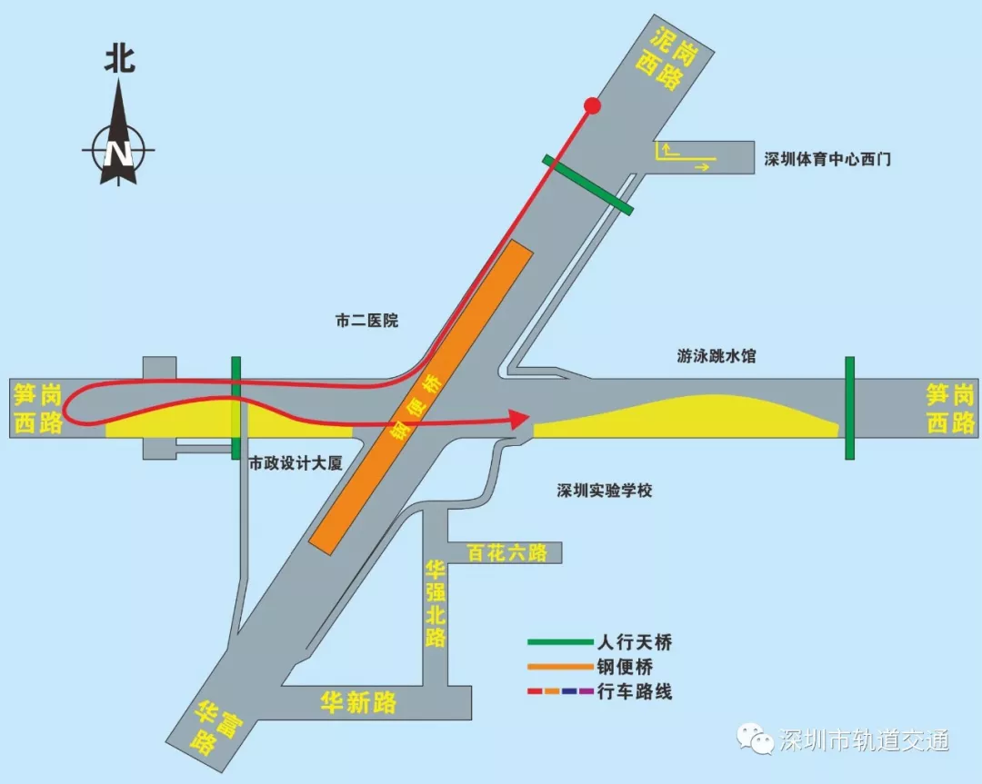 北轉(zhuǎn)東(泥崗西路左轉(zhuǎn)筍崗西路):泥崗西路通過市二醫(yī)院旁三車道的過境車道或橋墩之間的新建車道右轉(zhuǎn)筍崗西路,隨后在掉頭口處掉頭,直行通過原平交路口,完成左轉(zhuǎn)。(詳見圖8)