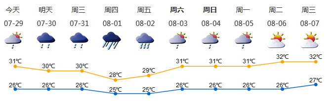 預(yù)計30-31日陰天間多云,有陣雨或雷陣雨,局部暴雨;8月1日 -2日有一次暴雨降雨過程。8月3日 -5日降雨減弱,多云有陣雨或雷陣雨。