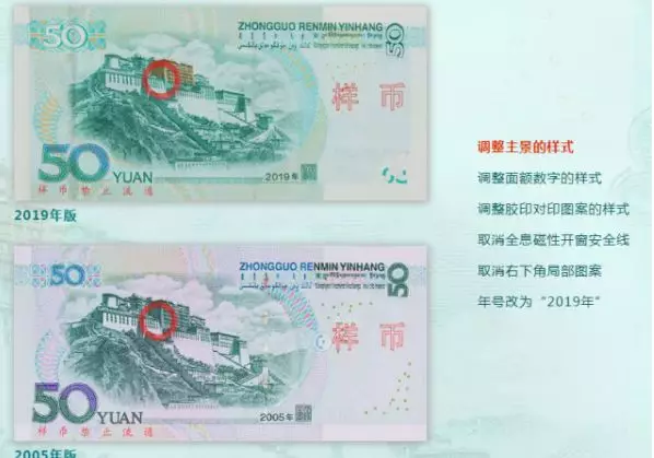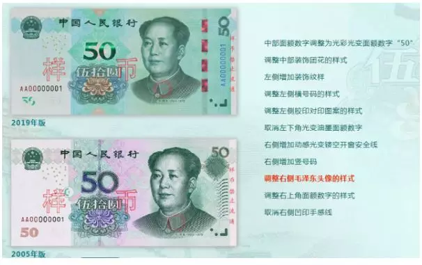 2019年版第五套人民幣50元、20元、10元、1元紙幣分別保持2005年版第五套人民幣50元、20元、10元紙幣和1999年版第五套人民幣1元紙幣規(guī)格、主圖案、主色調(diào)、“中國人民銀行”行名、國徽、盲文面額標(biāo)記、漢語拼音行名、民族文字等要素不變,提高了票面色彩鮮亮度,優(yōu)化了票面結(jié)構(gòu)層次與效果,提升了整體防偽性能。2019年版第五套人民幣50元、20元、10元、1元紙幣調(diào)整正面毛澤東頭像、裝飾團(tuán)花、橫號碼、背面主景和正背面面額數(shù)字的樣式,增加正面左側(cè)裝飾紋樣,取消正面右側(cè)凹印手感線和背面右下角局部圖案,票面年號改為“2019年”。