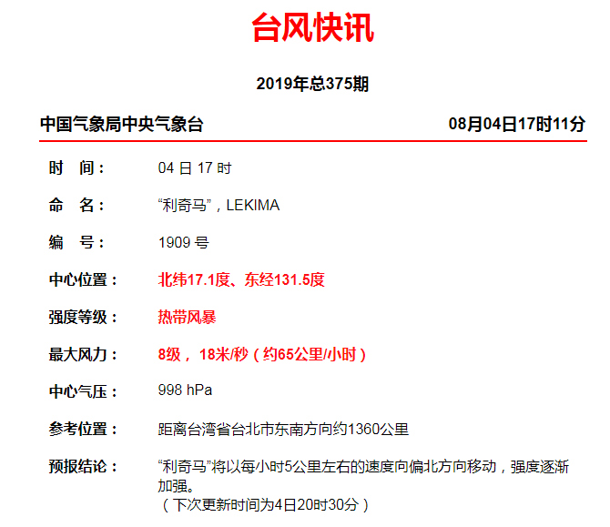 今年第9號臺(tái)風(fēng)"利奇馬"(熱帶風(fēng)暴級)(英文名稱:LEKIMA;名字來源:越南;名字意義:一種水果)已于4日下午在西北太平洋洋面生成,17時(shí)其中心位于我國臺(tái)灣省臺(tái)北市東南方約1360公里的西北太平洋洋面上,中心附近最大風(fēng)力8級(18米 /秒),中心最低氣壓998百帕,七級風(fēng)圈半徑250-420公里。